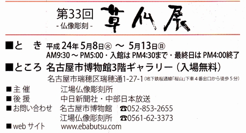 - 仏像彫刻展のお知らせ ~第31回仏像彫刻美術展~仏師・矢野公祥先生主催の仏像彫刻・仏教美術展 「第31回仏像彫刻美術展」が開催されます。 …