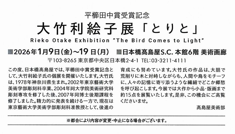 - 木彫展のお知らせ ~大竹利絵子 とりと~東京藝術大学彫刻科の准教授を勤めておられます 木彫家・大竹利絵子先生の作品展 「とりと」が日本橋高島屋さんにて開催されます。 …