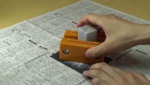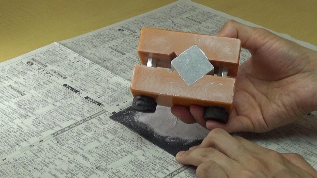 まずはてん刻プラバイスに印材を挟みます。印面をプラバイスの下面から少し出るようにして紙やすり(#240)で削ります。