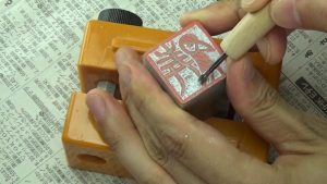 今後は印面が上になるように。また、印面はプラバイスの上面から2~3cmくらい出すと彫りやすいです。