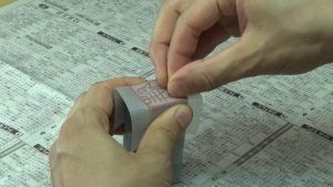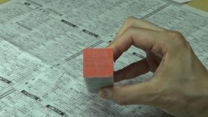 てん刻バレンの使い方は、まずその上に紙を乗せ、印泥を付けた印面を載せます。