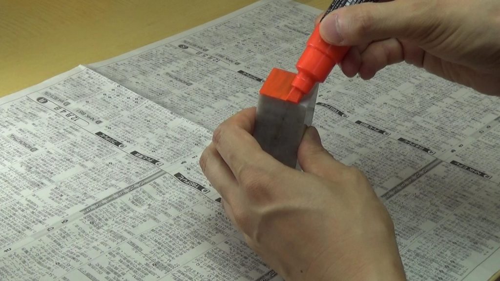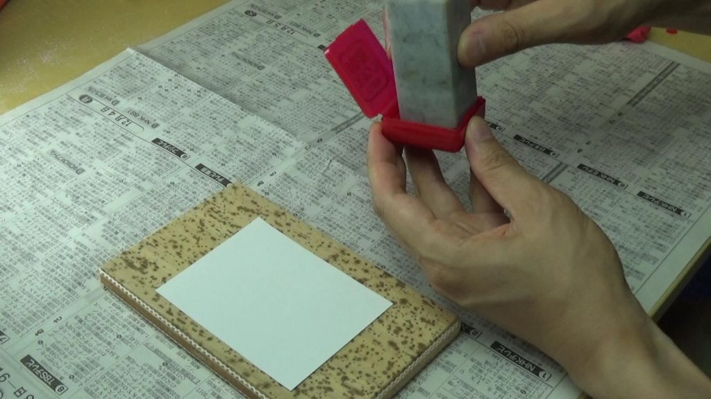印泥に印面を押し付けず、『ポンポンピタピタ』を何回か繰り返してやさしくつけます。捺す前に印面を目視確認しましょう。