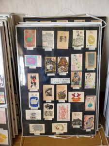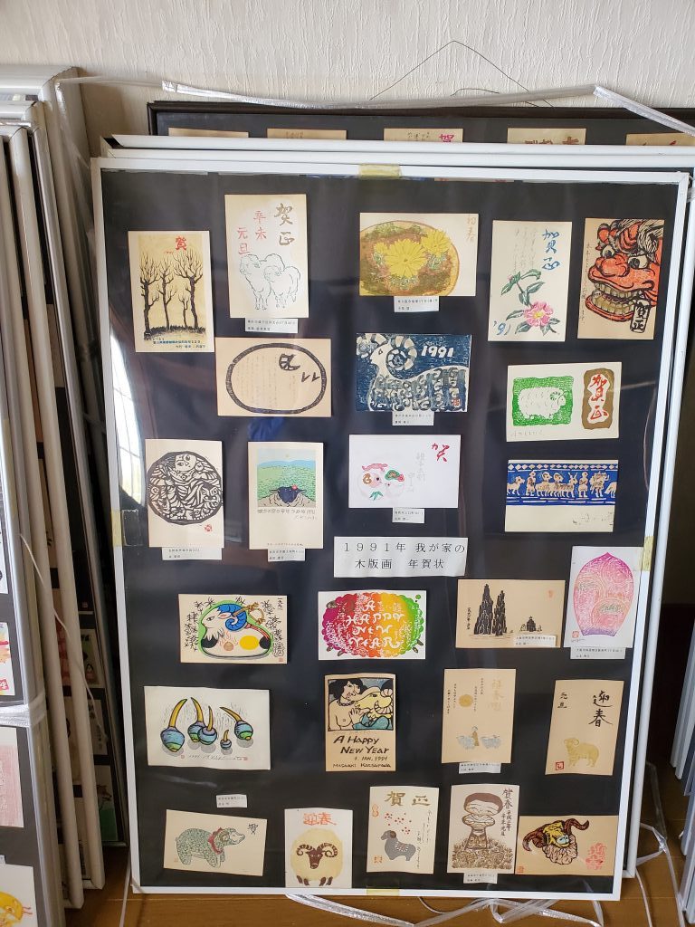父が自分の干支(ヒツジ)でスタートした年賀状木版画。1991年より毎年欠かさず、全国から寄せられた年賀状をパネルにしてはや30年以上が経過しました。
