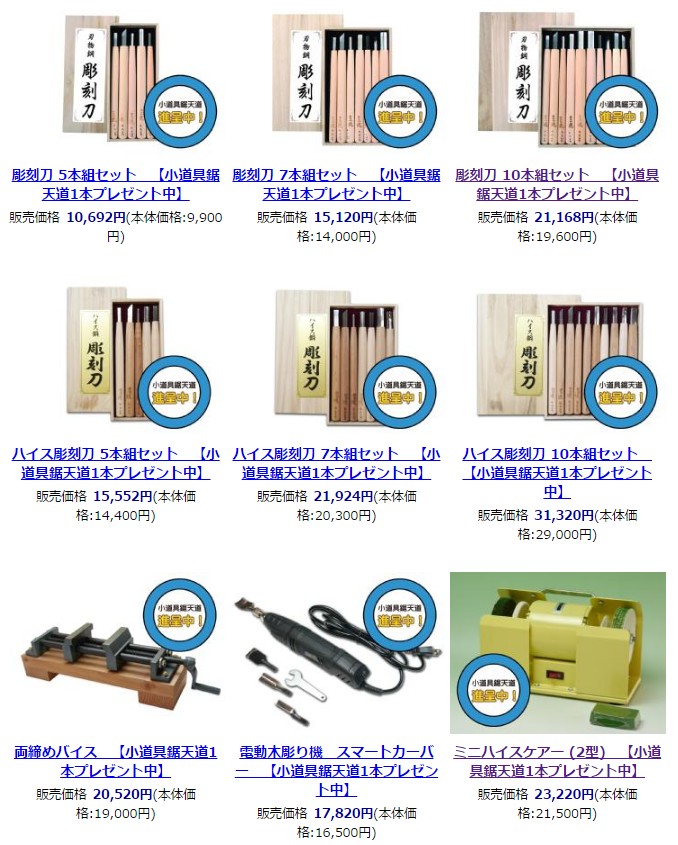 対象商品は彫刻刀セットや研ぎ機、木彫機、両締めバイスなど。