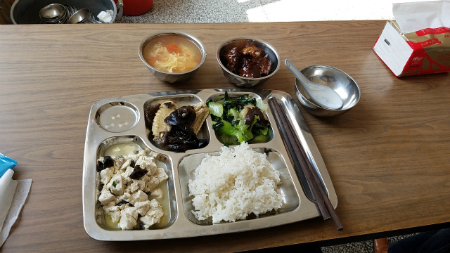 いつも美味しくいただいている先方の工場のランチ。従業員の方も一緒に。