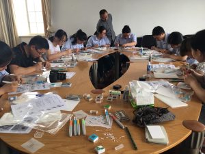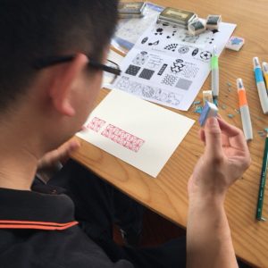 消しゴムはんこの講習会。講師は、(二日酔いの)私です。