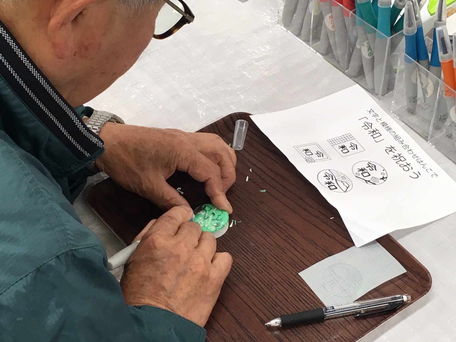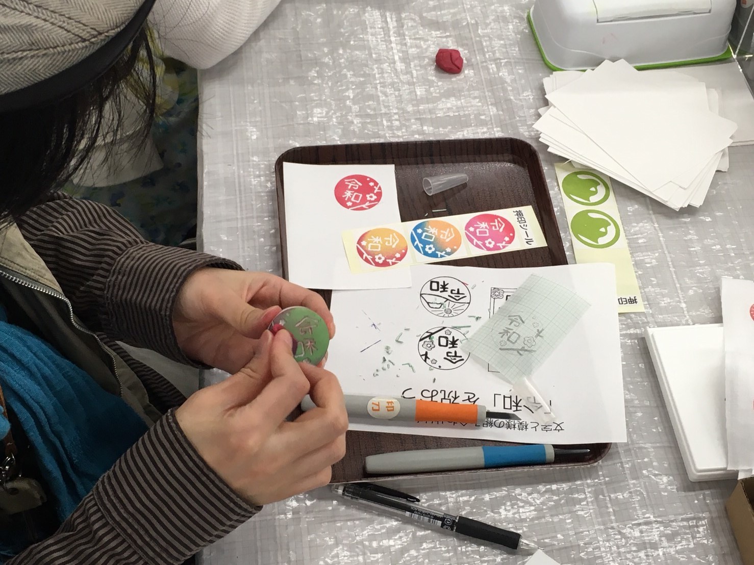 新元号の「令和」をモチーフにしたゴムハンを制作。