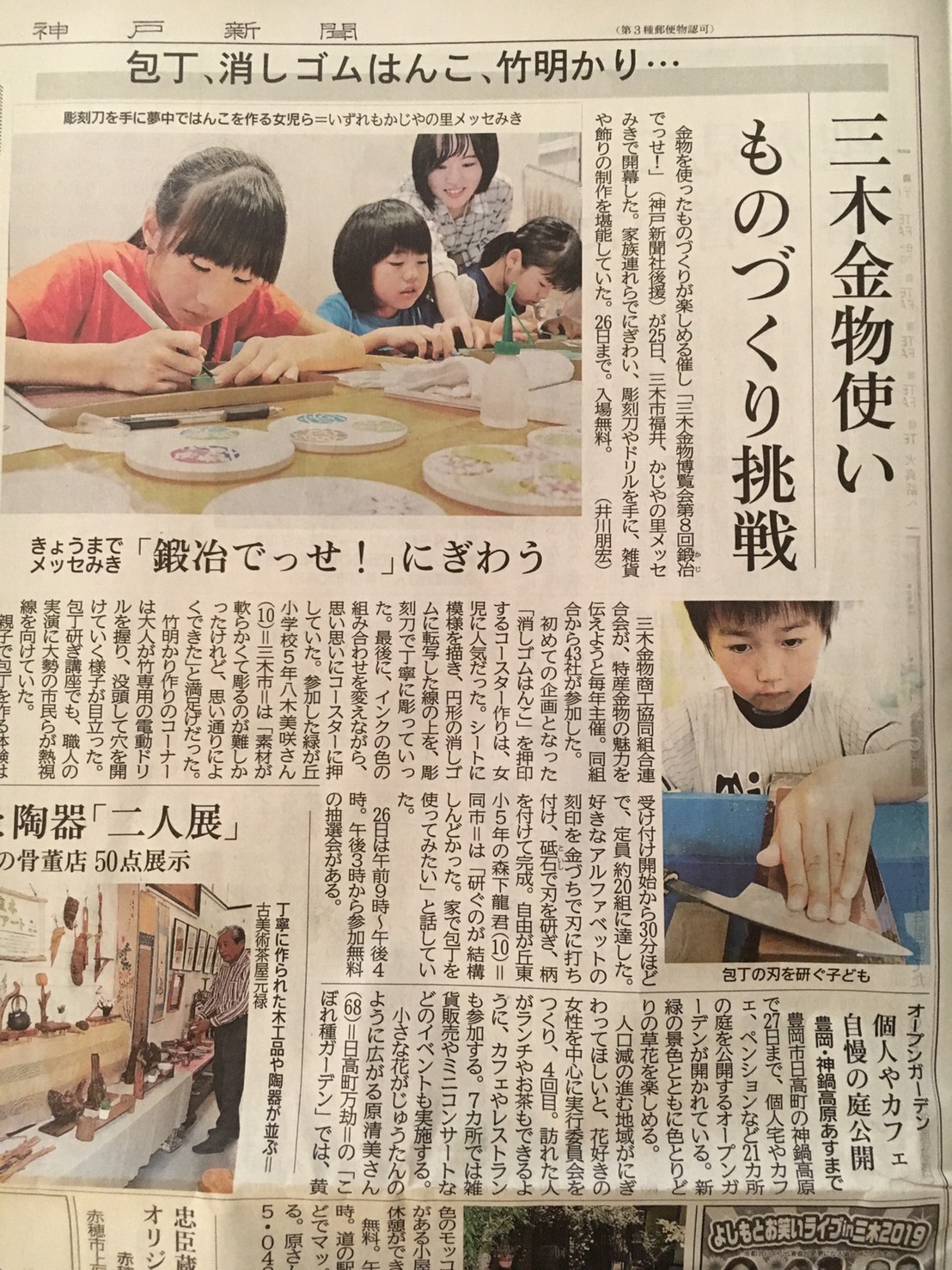 日曜日の神戸新聞朝刊にちょうど土曜日の鍛冶でっせの様子が弊社のブースを中心にがデカデカと掲載。